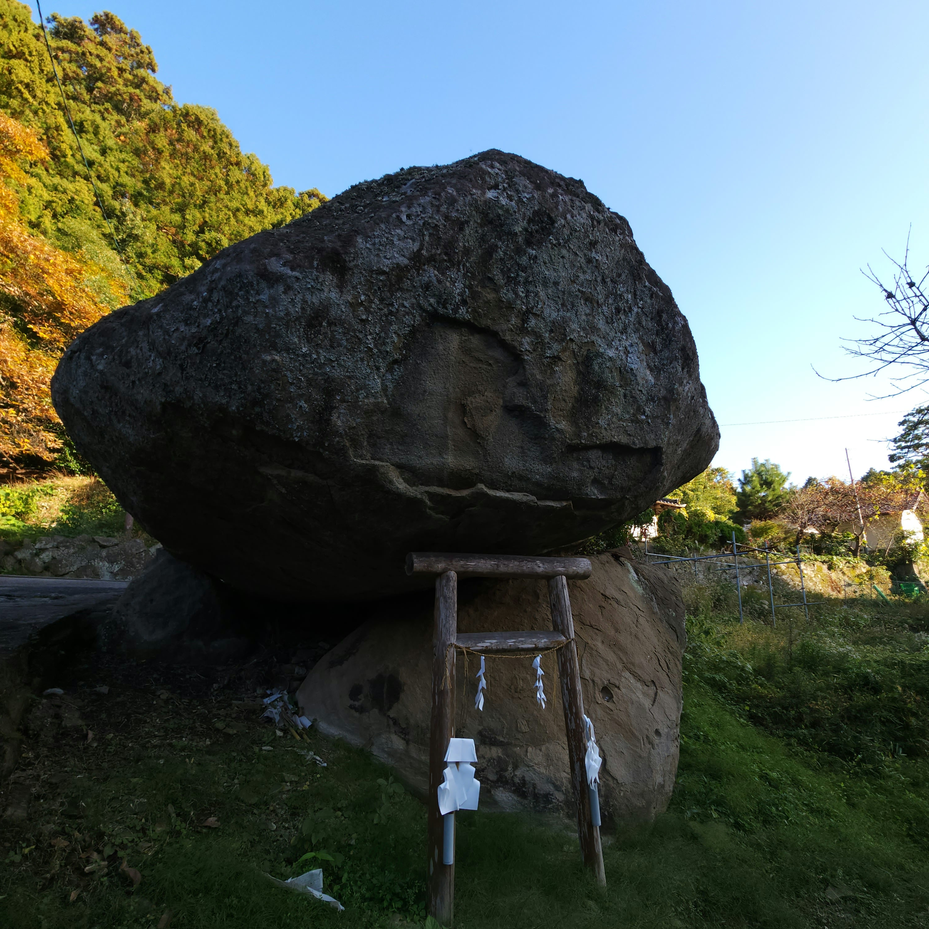 伝説によると,かの武蔵坊弁慶が宍道湖の北岸から蹴っ飛ばした岩が南岸のここまで飛んだらしい(笑) 岩の上に乗っかってるように見えるが,実際には繋がっている。地元では「来待石」と呼ばれる凝灰質砂岩で加工しやすいのが特徴。