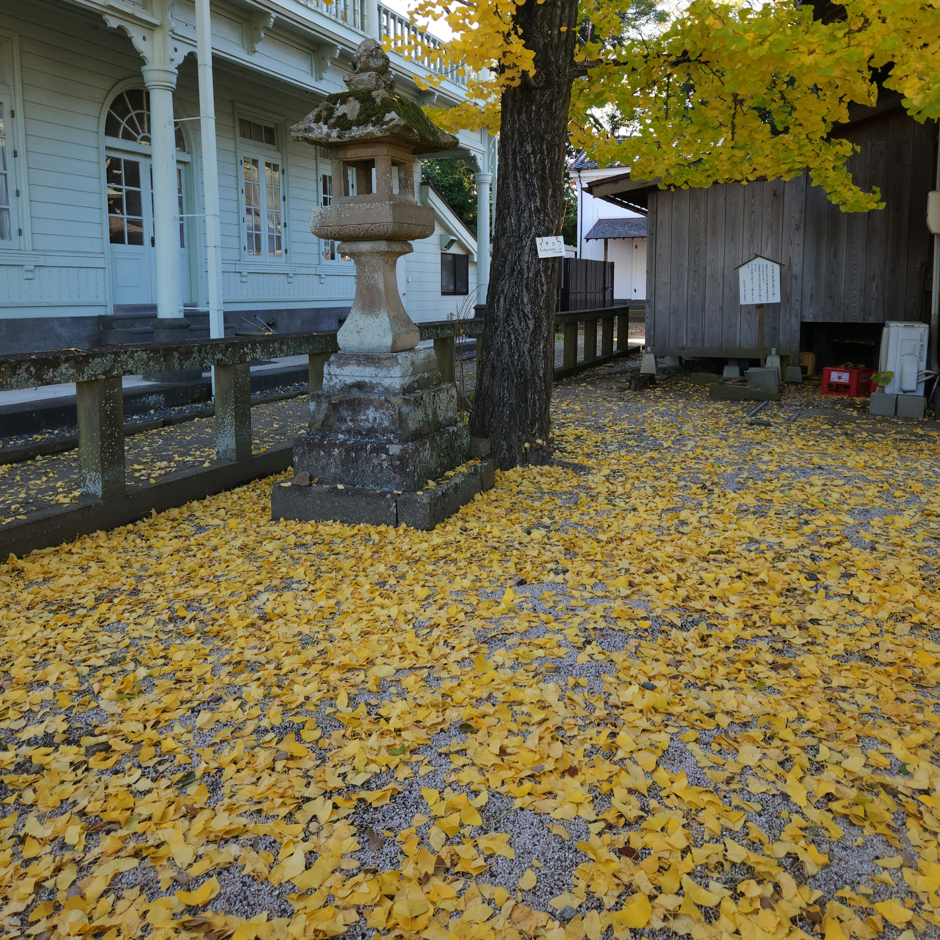 松江神社境内には銀杏の木があってこの時期はこんな感じの絨毯になる。ちなみに左の青っぽい壁の建物が興雲閣。中に喫茶室があってレトロでおしゃれな雰囲気が良い。